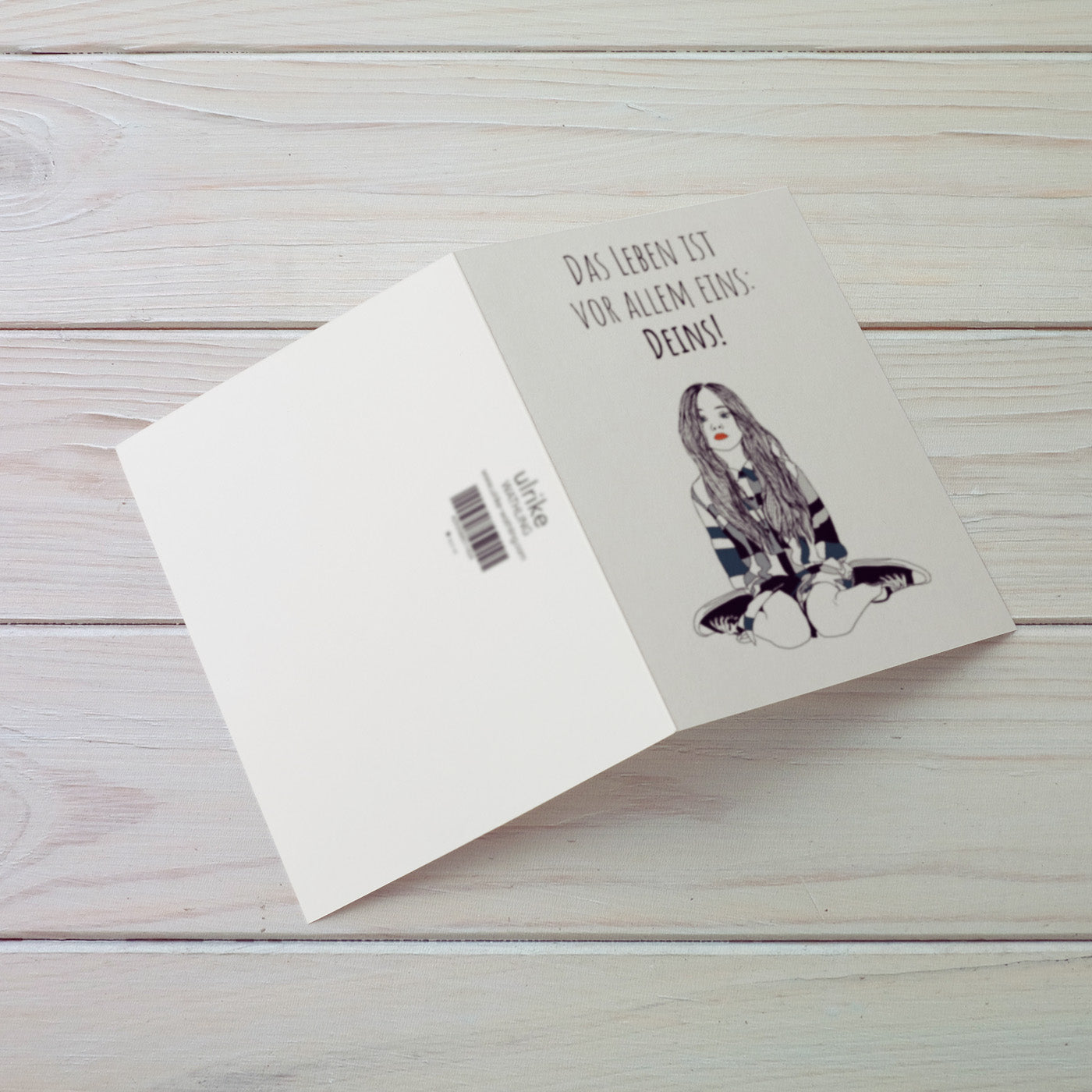 Du suchst eine besondere Grußkarte, die mehr sagt als tausend Worte? Die Klappkarte mit dem Spruch „Dieses Leben ist vor allem eins: Deins!“ ist eine liebevolle Erinnerung daran, dass jeder Mensch seinen eigenen Weg gehen darf – mutig, frei und selbstbestimmt. Perfekt zum Danke sagen, zum sich bedanken oder einfach so – als kleine Aufmunterung oder herzlicher Gruß zwischendurch.