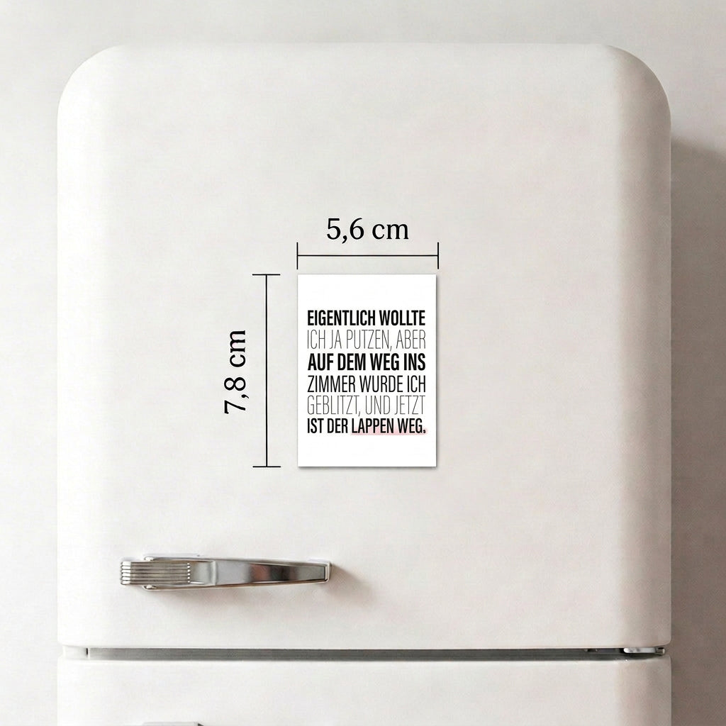 Du brauchst dringend einen Alltagshelfer, der dich zum Lachen bringt? Dann haben wir den perfekten Kühlschrankmagnet für dich - unser Magnet mit dem lustigen Spruch "Eigentlich wollte ich ja putzen, aber auf dem Weg ins Zimmer wurde ich geblitzt und jetzt ist der Lappen weg".