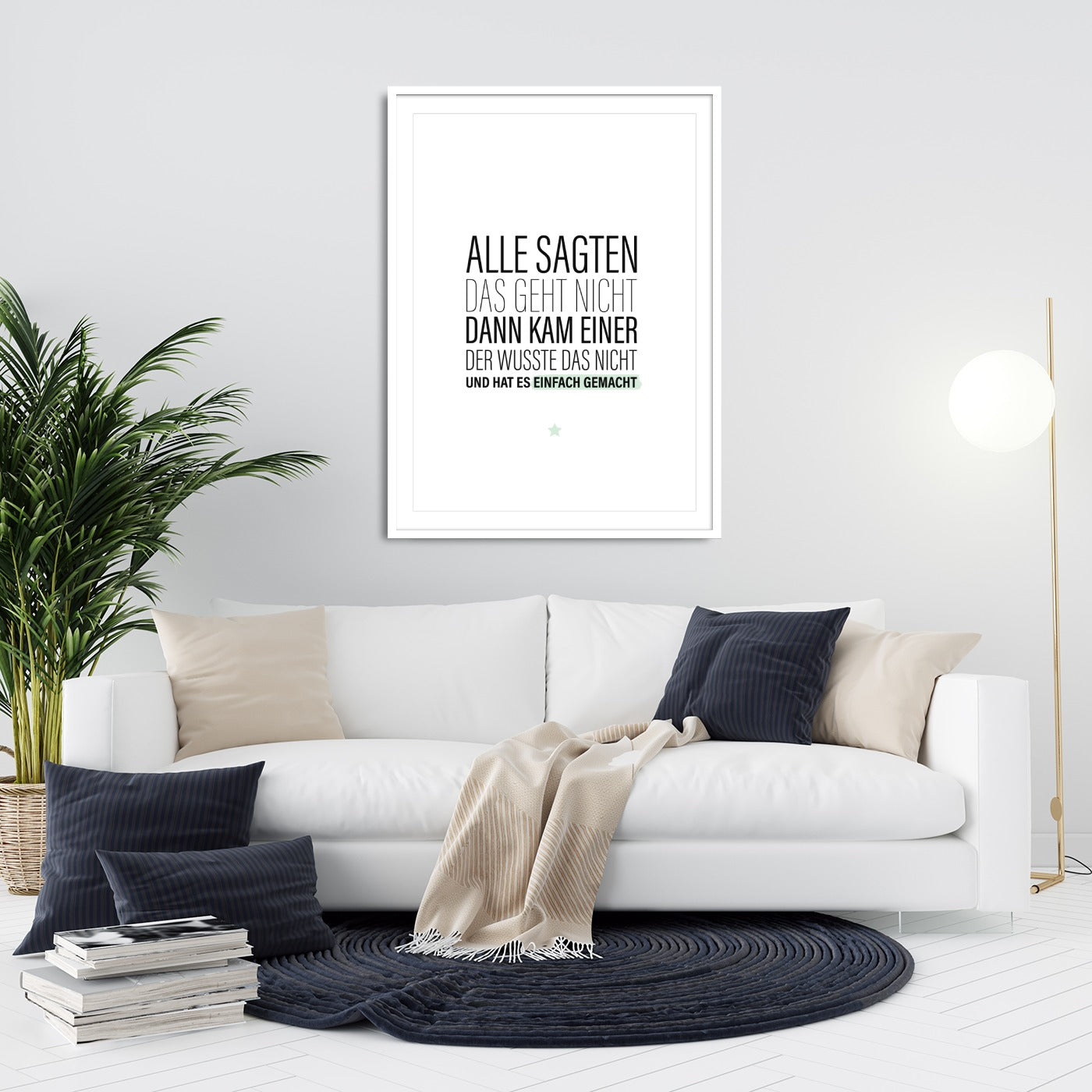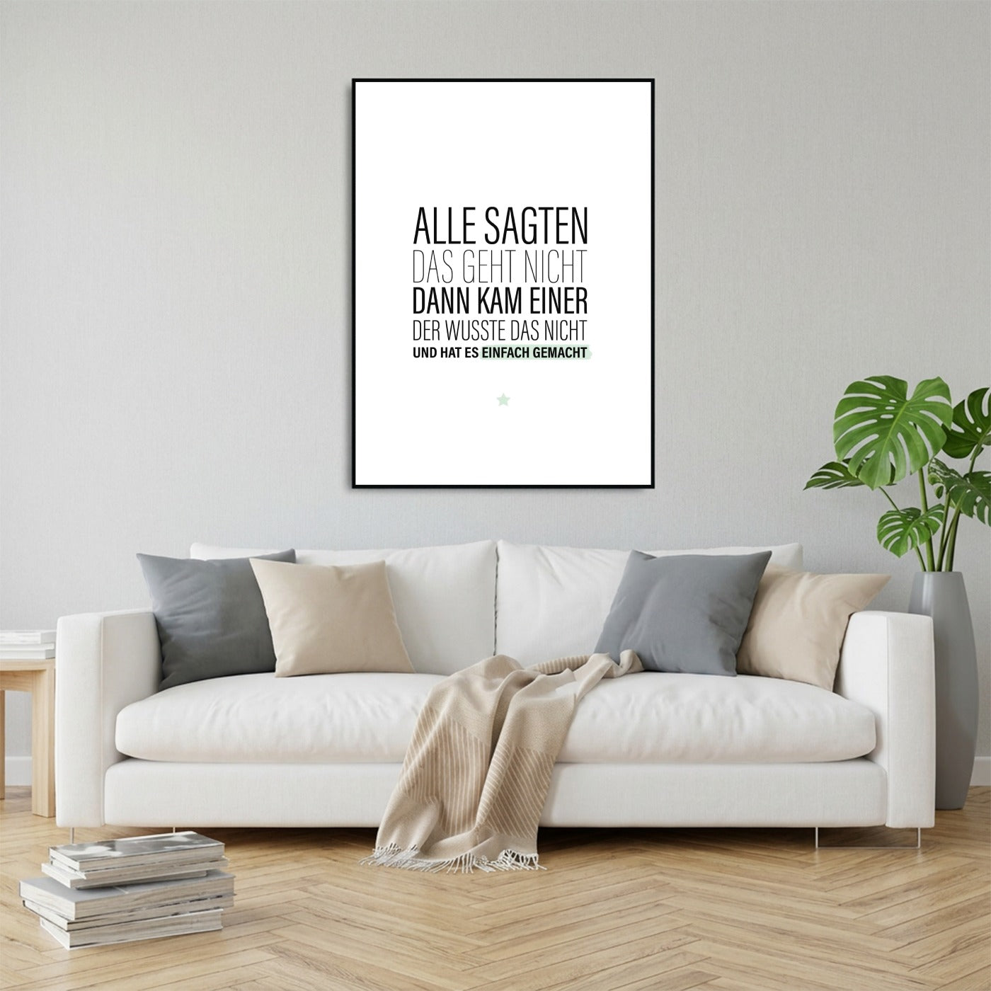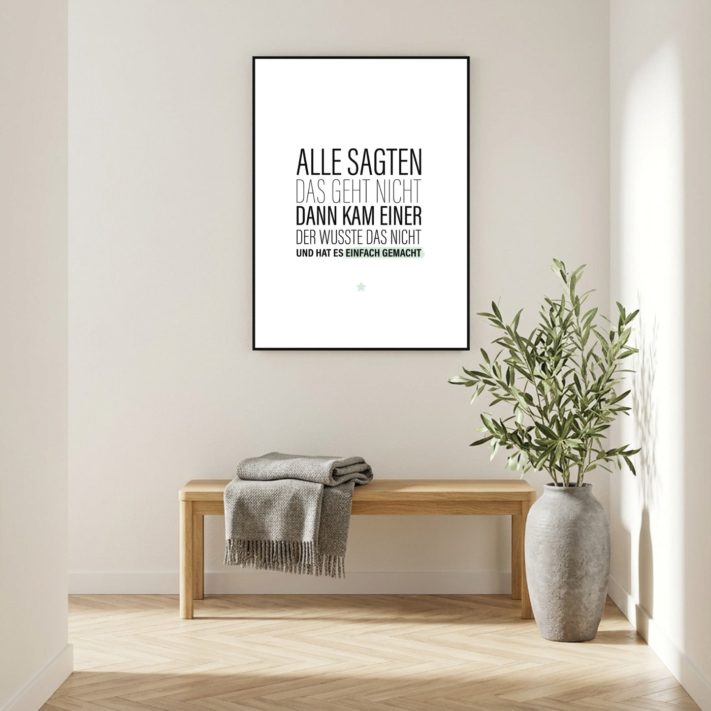 Alle sagten das geht nicht, dann kam einer der wusste das nicht und hat es einfach gemacht. Die meisten Grenzen entstehen im Kopf. Lässt Du Dich auch von den Grenzen anderer Menschen beeinflussen oder gehst Du lieber Deinen eigenen Weg? Dieses Poster soll Dich dazu ermutigen, auf Dich und Deine eigene Stimme zu hören und Deine Fähigkeiten selbst einzuschätzen. Wenn andere Menschen zu Dir sagen "das kann nicht klappen", dann ist es deren Meinung und Einschätzung. Sie würden es sich vermutlich selbst nicht zutrauen. Es sagt aber nichts über Dich und Deine Fähigkeiten aus. Handele immer intuitiv und besinn Dich auf Deine eigene Stärke. Und falls es doch mal nicht funktioniert, dann war es zumindest eine Erfahrung. Dieses Poster ist die perfekte Wanddeko für alle, die über sich selbst hinauswachsen wollen. Der motivierende Spruch versorgt Dich mit Kraft und Ansporn. Dieses Motiv ist übrigens auch als Postkarte und Magnet hier im Onlineshop erhältlich.
