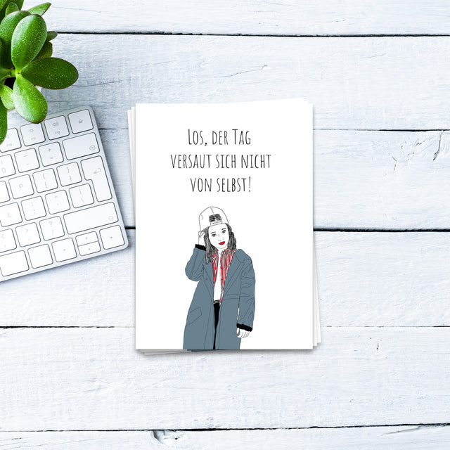 Manchmal hilft nur schwarzer Humor. Diese Postkarte mit dem Spruch „Los, der Tag versaut sich nicht von selbst.“ bringt genau das auf den Punkt – klar, direkt und mit einem Augenzwinkern. Perfekt, wenn Du jemandem zum Lächeln verhelfen willst, ganz ohne Kitsch.